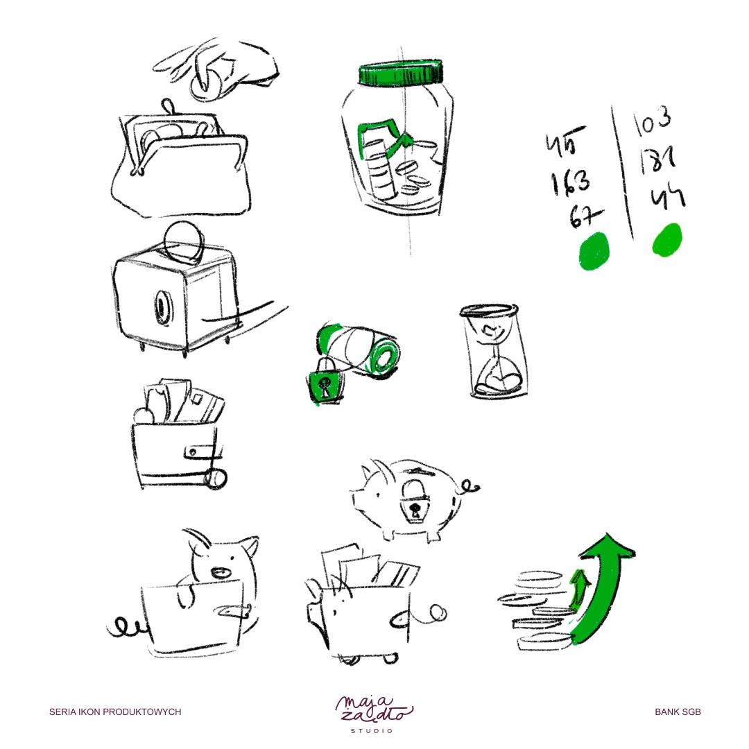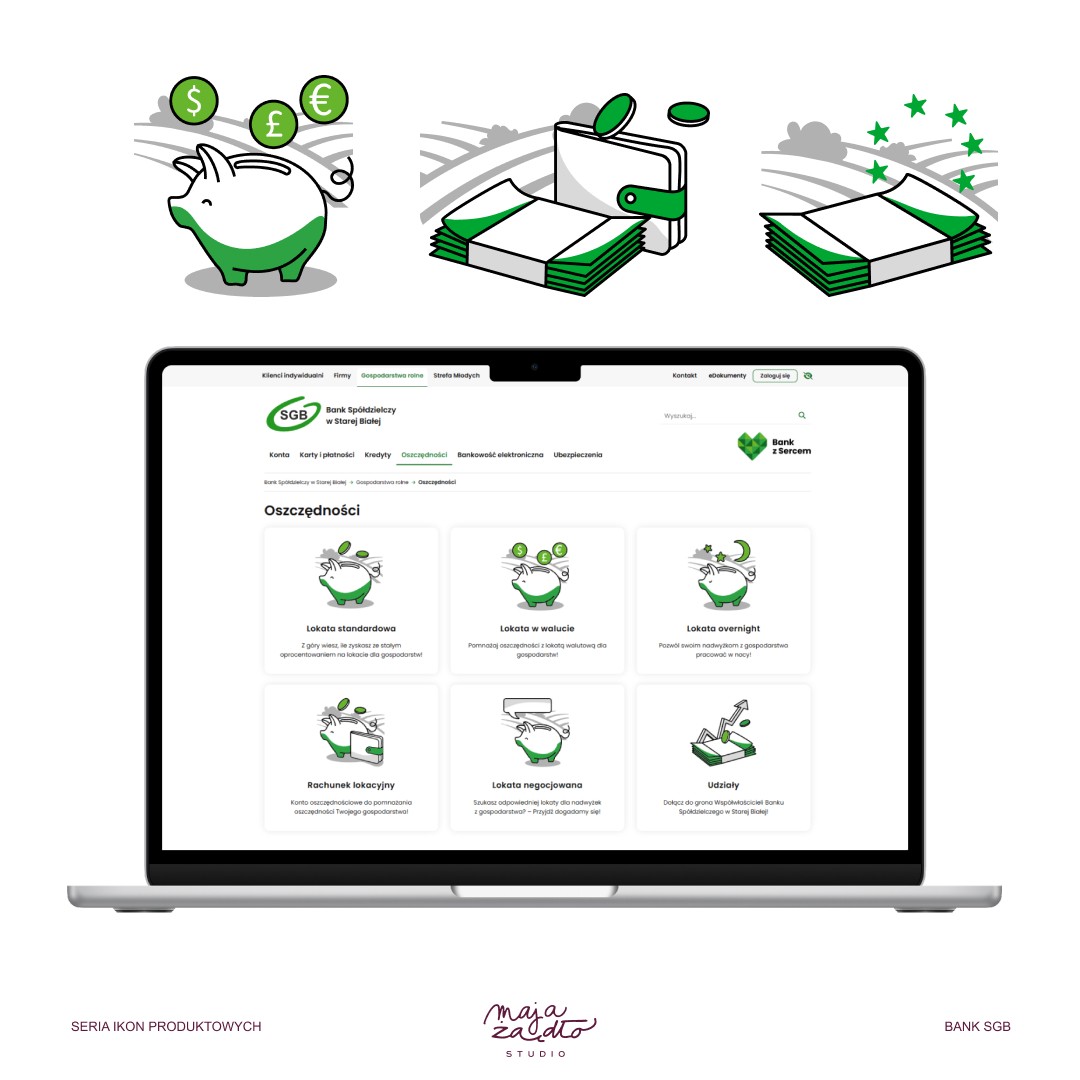 Kompleksowy projekt systemu ikonograficznego dla banku - zestaw ikon porządkujących strukturę oferty i ilustrujących produkty bankowe w ramach redesignu strony internetowej.